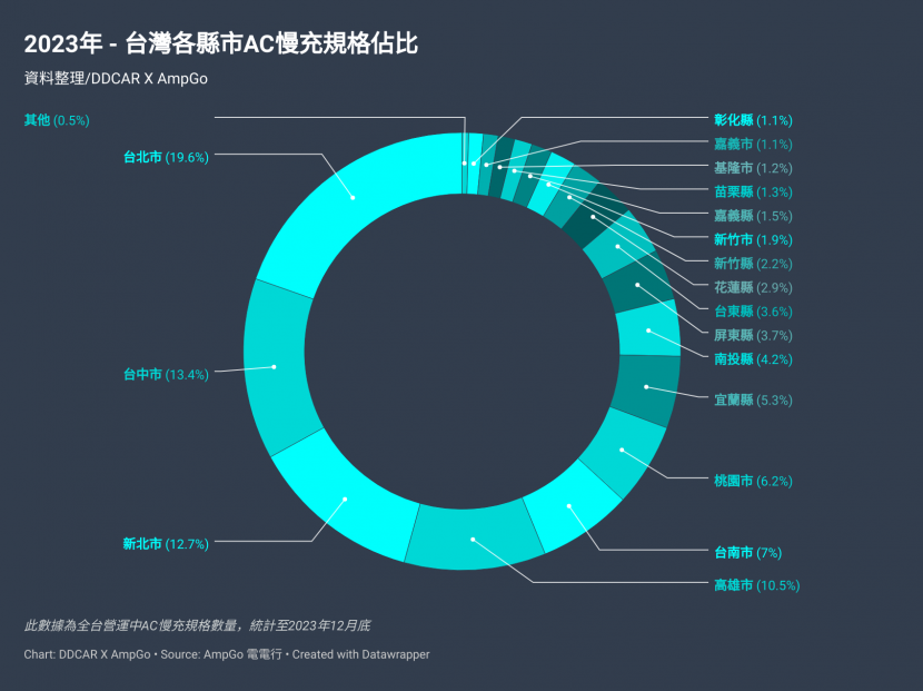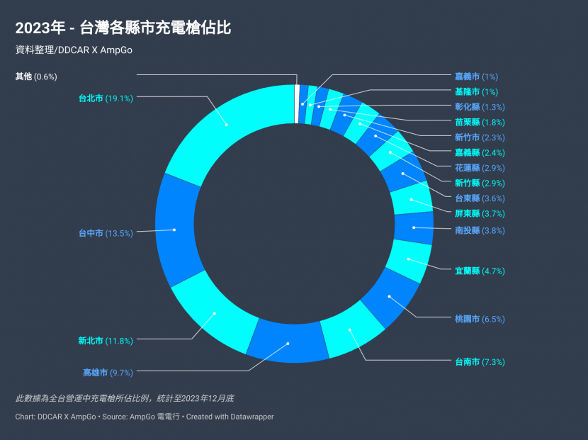 根據 AmpGo 電電行的統計,截至 2023 年 12 月底全台營運中 (建置完成未啟用、維修中暫時關閉等非營運中站點不列入計算) 的 AC + DC 充電站點共有 2,081 座,擁有最多充電站點資源的前六個縣市,則依序分別是台北市、台中市、新北市、高雄市、台南市、宜蘭縣。