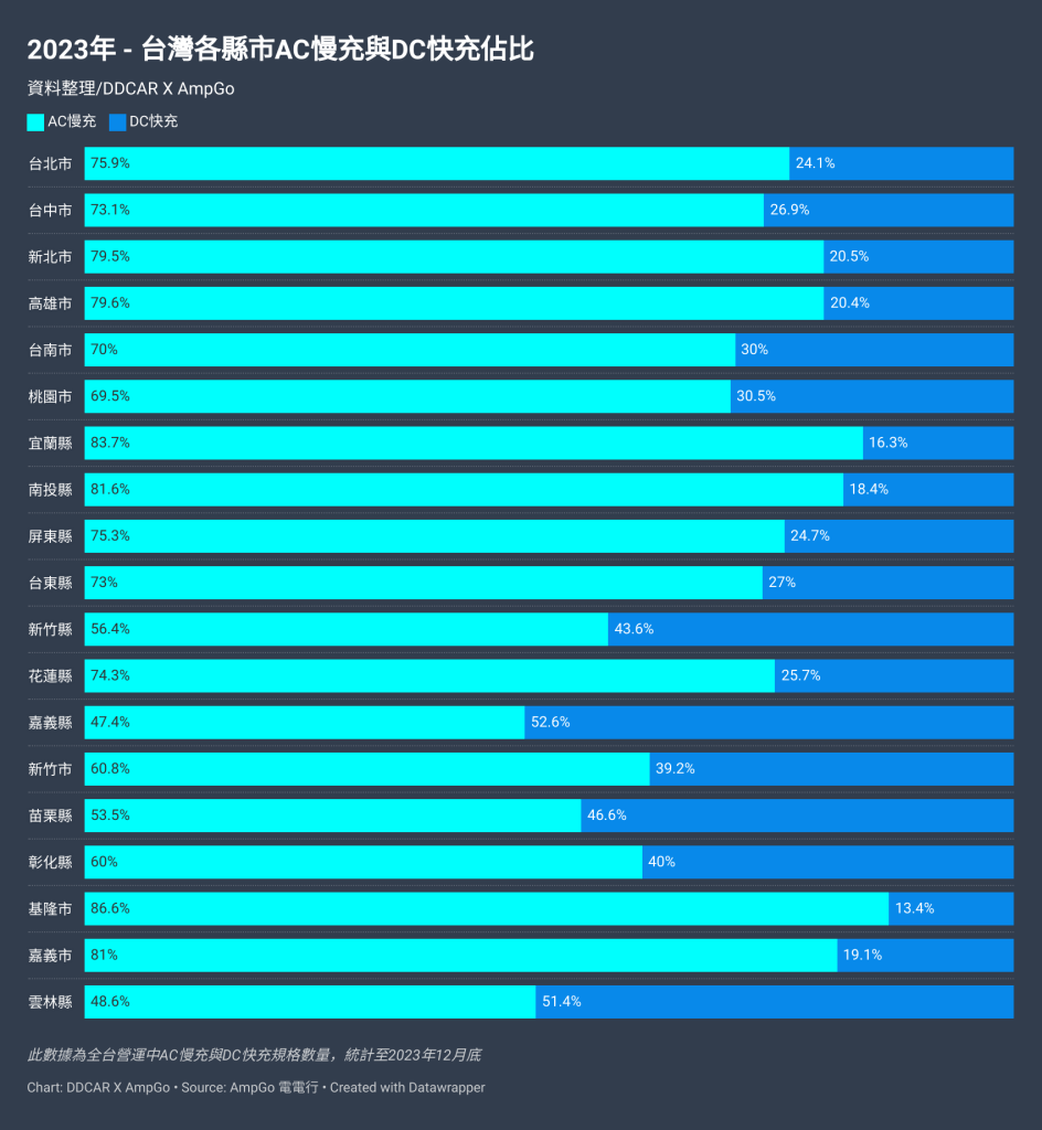 看完充電站點、充電槍的全台分布現況,接著要來揭曉 2023 年各縣市 DC 快充、AC 慢充的分佈狀況。