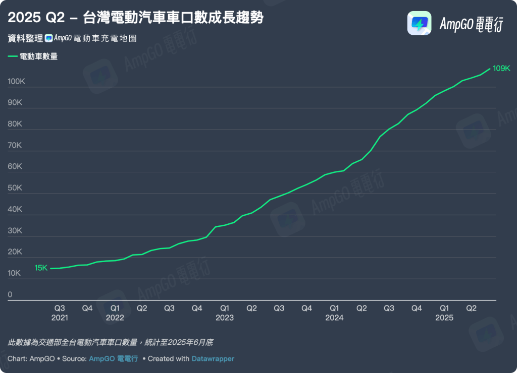 根據 AmpGO 電動車充電地圖統計,截至 2025 年 6 月底為止全台約有 108500 輛電動汽車。