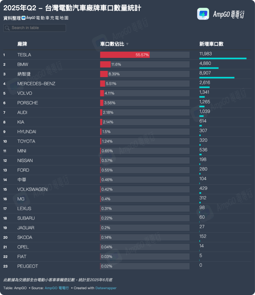 根據 AmpGO 電動車充電地圖統計,2024整年度的電動車新車佔比為 9.3%,2025年Q2的電動車新車佔比為 6.75%。